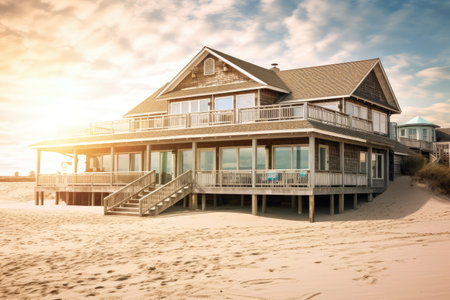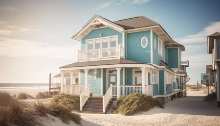 peaceful beach setting with cozy house in the background, created with generative ai