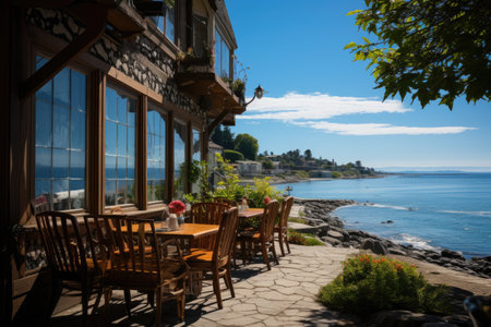 Tranquil coastline, modern luxury table, comfortable chair, nature beauty outdoors generated by artificial intelligence