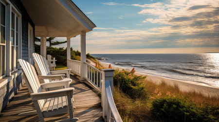 white house porch two chairs soft sanded coastlines commercial blissful landscape gambrel roof building beaching welcoming attitude bed right, generative ai
