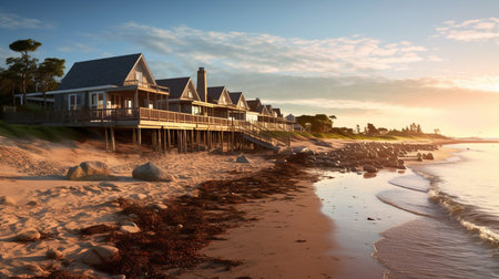 a peaceful and picturesque beach town, where weathered beach houses and a quiet pier line the shore. The tranquil beach is perfect for long walks and contemplation, with gentle waves lapping the shore