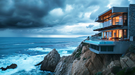 Seaside cottage overlooking crashing waves under dramatic evening