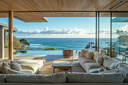 Modern living room featuring large windows with breathtaking ocean views. The space is designed with comfortable seating, soothing colors, and natural decor elements, creating a tranquil and inviting atmosphere perfect for relaxation and enjoyment.