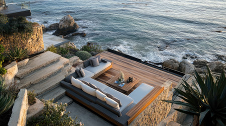 Coastal patio oasis with ocean view and relaxing wooden furniture. That the image is generated using AI.