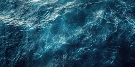 Deep blue ocean water with swirling waves and splashes. Top view of vibrant seascape with sea water