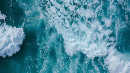 This stunning image captures the mesmerizing aerial view of the ocean with strong waves crashing, appearing in vibrant turquoise hues and dynamic patterns, showing the sheer power and beauty of nature's forces. AI generated image
