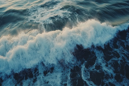 An aerial perspective showcases ocean waves in shades of deep blue and white foam. The image captures the movement and texture of water, with visible patterns of waves. This composition, likely taken from above, depicts a dynamic scene suitable for various commercial and editorial applications, emphasizing natural elements.