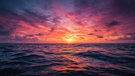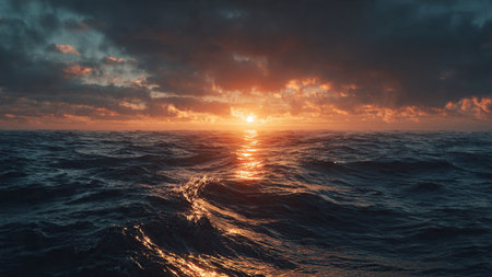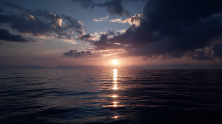 dark blue oceans and sky, with sunsets for a dramatic and peaceful scene, created with generative ai
