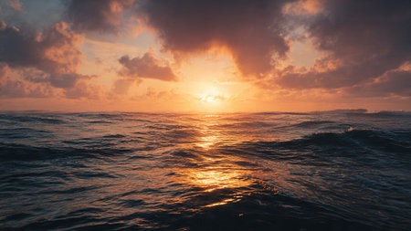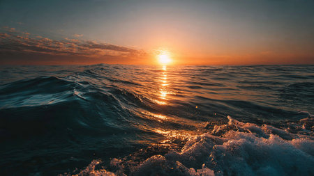 Serene sunset over ocean creates beautiful reflection on water surface, showcasing vibrant hues of orange and gold. calm waves gently ripple, enhancing tranquil atmosphere