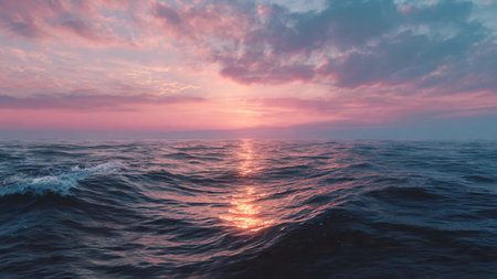 A breathtaking view of a serene ocean horizon at sunset, featuring a stunning gradient of pink and blue hues reflecting on a calm water surface, ideal for evoking tranquility.