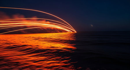 A rocket launches at night, leaving a bright trail in the sky. The calm waters reflect the vibrant light, creating a stunning scene of technology and nature.