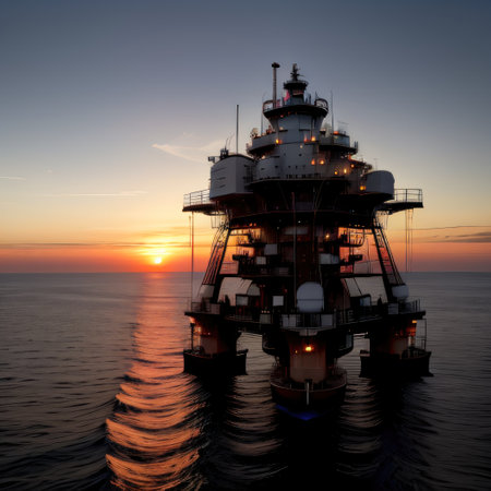 A large, illuminated offshore oil rig stands tall in the water at dusk. The rig's lights cast a warm glow against the darkening sky, while the platform's silhouette is framed by the rippling water. AI