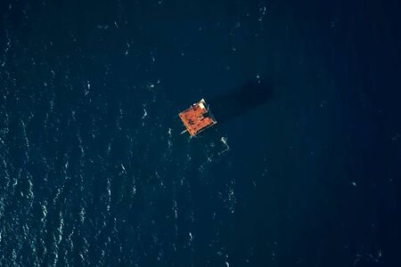 Stunning aerial view showcasing an offshore oil rig platform in vast ocean waters, accompanied by a supply boat, highlighting industrial energy extraction and engineering operations.