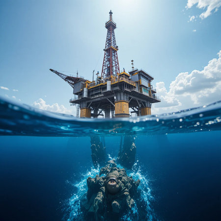 Offshore oil rig extracting fossil fuels in the ocean amid growing climate change concerns