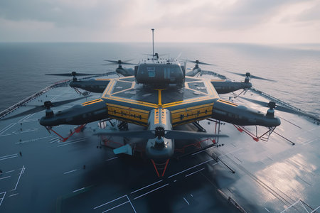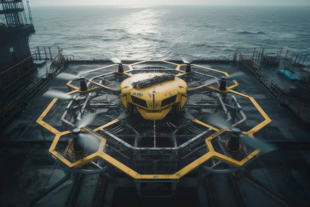 An AI generated illustration of a large yellow delivery drone flying over the sea, supplying oil rigs