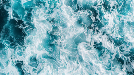Aerial view of chaotic white foamy sea waves, symbolizing the powerful force of nature.