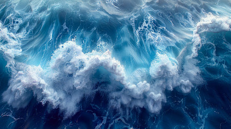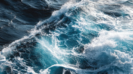 Aerial view of tumultuous ocean waves showcasing intricate foam patterns. The deep blue waters create a dynamic and captivating natural scene.