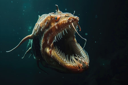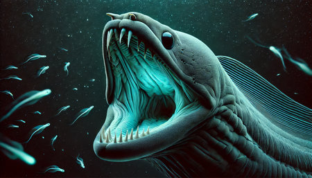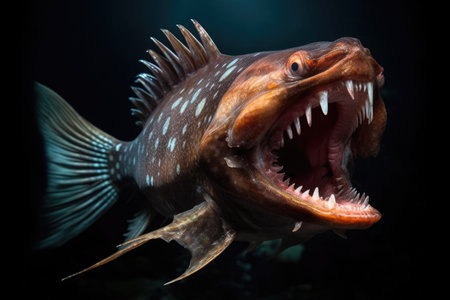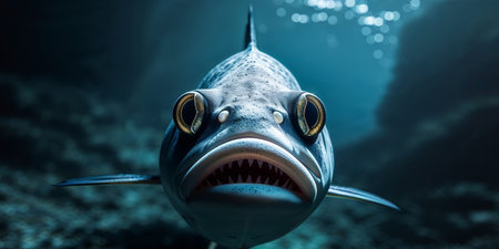 AI Generated. Striking Fish Face With Sharp Teeth and Large Eyes Emerging From Dark Ocean Depths in Eye Level View