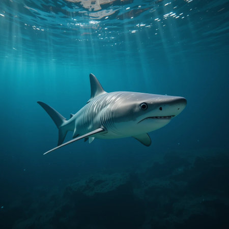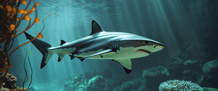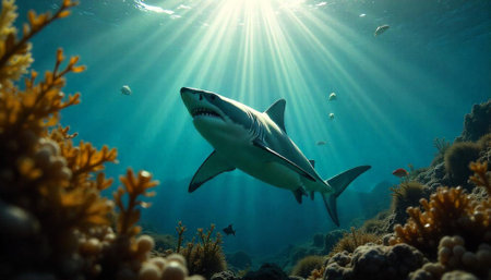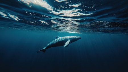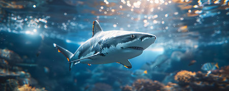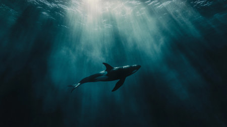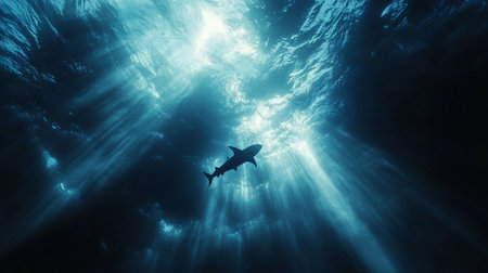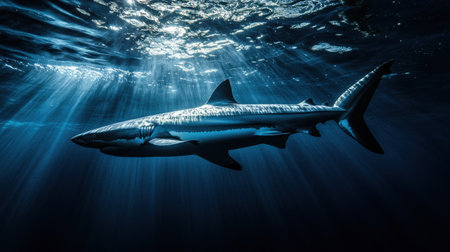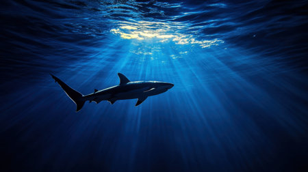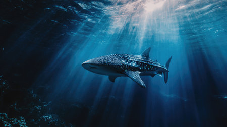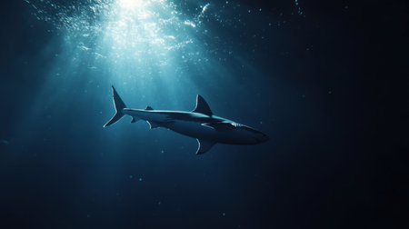 A serene underwater scene featuring a majestic shark swimming gracefully in the deep blue ocean, illuminated by stunning sunrays filtering through the water surface.