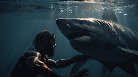 A massive, aggressive shark swims among the people swimming in the sea. Danger looms beneath the calm waters, with its power and predatory instincts poised to strike. AI Generative AI