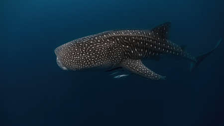 Massive whaleshark swimming in the deep with its large mouth open to feed on krill and planktons.