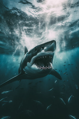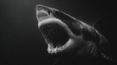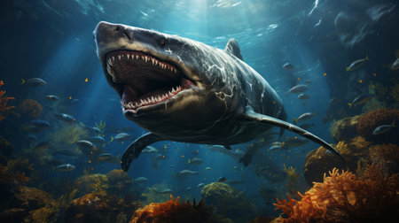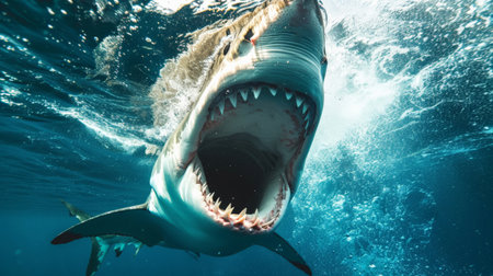 A stunning underwater depiction of a shark with its mouth wide open, showcasing its razor-sharp teeth. The image captures the beauty and power of this magnificent marine predator, highlighting the dynamic and elusive nature of sea life.