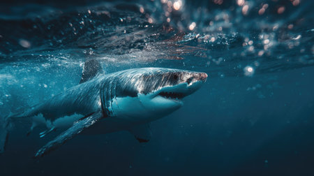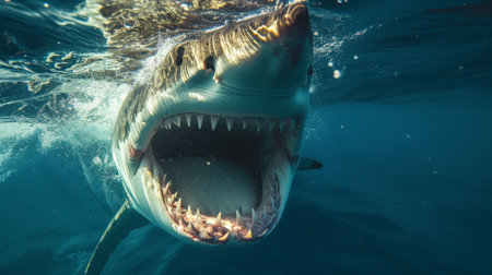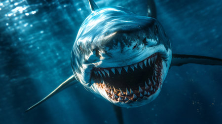 A stunning close-up view of a great white shark swimming in the deep blue ocean, showcasing its sharp teeth and powerful presence with sunlight filtering through the water.