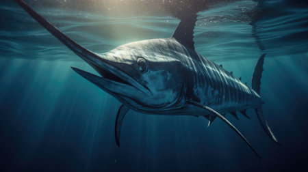 Swordfish swimming in deep blue ocean. 3D Rendering.