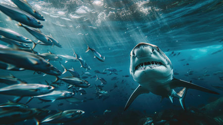 A dramatic shot of a great white shark circling its prey, showcasing its powerful jaws and streamlined body