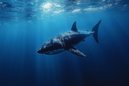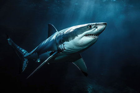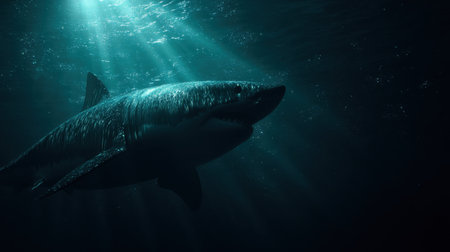 A stunning view of a great white shark swimming gracefully through dark ocean waters, illuminated by sunrays. This mesmerizing underwater scene captures the beauty and power of marine life in its natural habitat.
