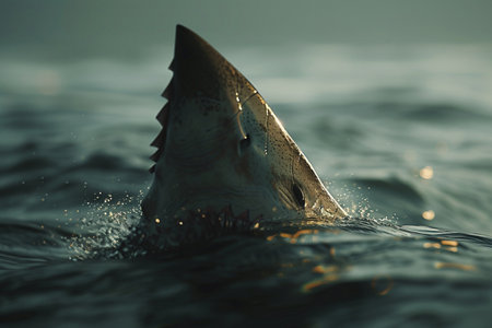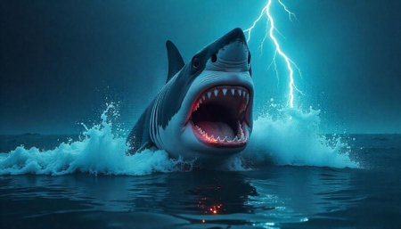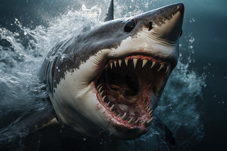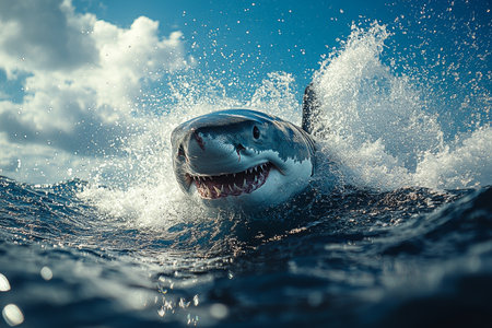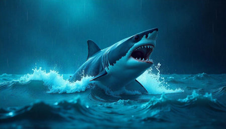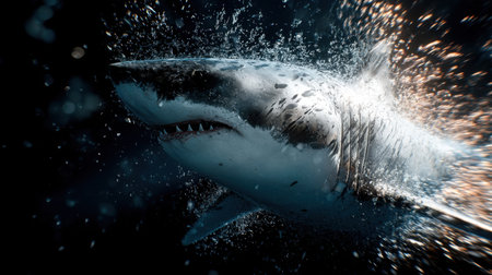 A breathtaking image of a great white shark breaching the water's surface, showcasing its powerful form and vibrant splashes of water under dramatic lighting, emphasizing the beauty and ferocity of ocean life.