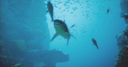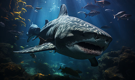 A powerful shark swims gracefully in vibrant blue waters, surrounded by smaller fish. The underwater scenery showcases a serene aquatic environment, highlighting marine life.