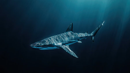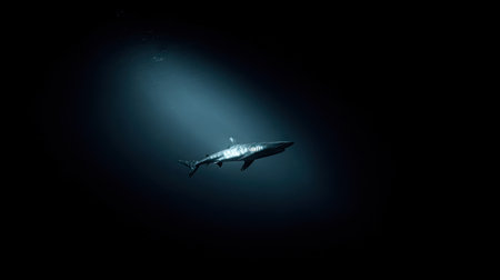 A shark swims through deep, dark water, illuminated by a beam of light. The composition features a high-contrast style with cool blue and black tones. The subject is centrally placed, emphasizing its form. The image could be used for educational, environmental, or commercial projects.