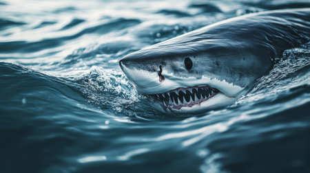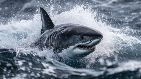 This stunning close-up captures the majestic great white shark as it emerges from the ocean waves, showcasing its powerful presence in the wild.