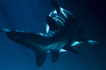 Underwater view of a shark swimming in the blue ocean with rays of light
