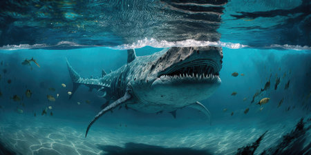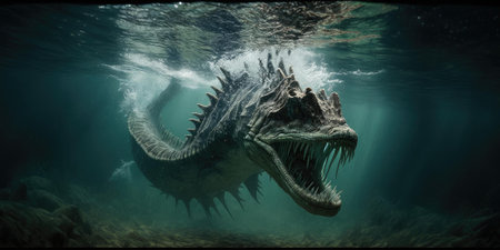 a prehistoric sea monster emerging from the depths of a dark ocean, its large jaws filled with razor-sharp teeth., created with generative ai