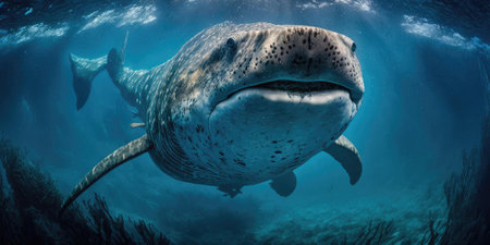 Discover the beauty of a whale shark gliding through crystal-clear waters. Sunlight streams down, illuminating its stunning patterns in this serene underwater scene.
