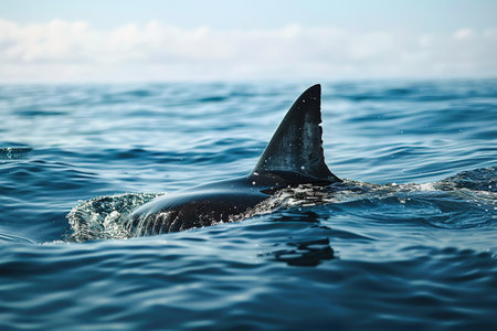 A striking image capturing a shark fin slicing through turbulent ocean waves beneath a dramatic sky, evoking a sense of danger and raw nature.