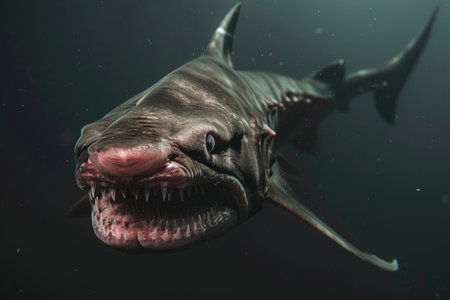 A mesmerizing close-up of a deepwater goblin shark in its natural habitat