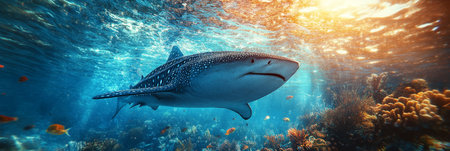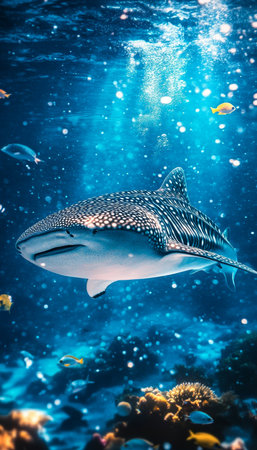 Majestic Whale Shark Glides Through Crystal-Clear Blue Ocean Waters, Sunbeams, Vibrant Coral Reef