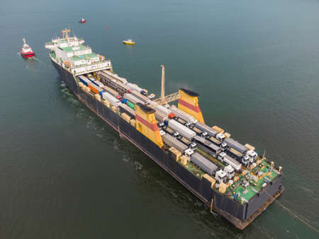 Aerial view on top of cargo ship carrying container and running for export cargo yard port to international custom ocean. Concept of technology transportation , customs clearance,