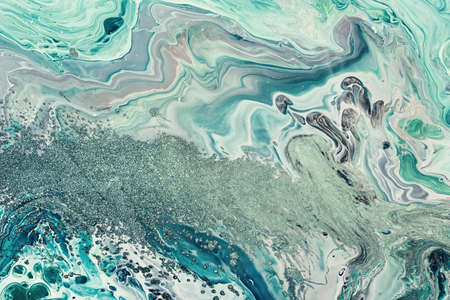 Acrylic ink water. Sea storm. Cyan blue ocean wave splash with white foam effect. Marble texture creative design. Nature art background. Mineral rock abstract pattern with fleck sparkles.
