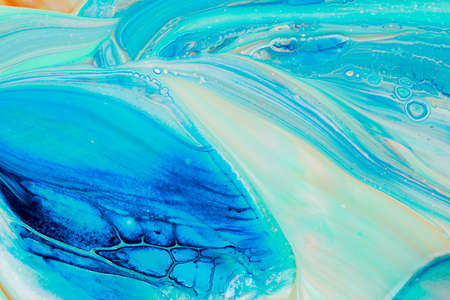 Fluid Art acrylic paints. Abstract mixing blue green waves. Liquid flows splashes. Marble effect background or texture