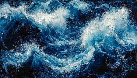 Dynamic swirling currents in shades of blue and white evoke the motion and energy of ocean tides in an artistic, textured composition.