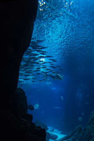 Beautiful amazing underwater world with fish and Ocean and Marine Wildlife with stingrays in the depths with cliff. Oceanarium in Lisbon, Portugal.