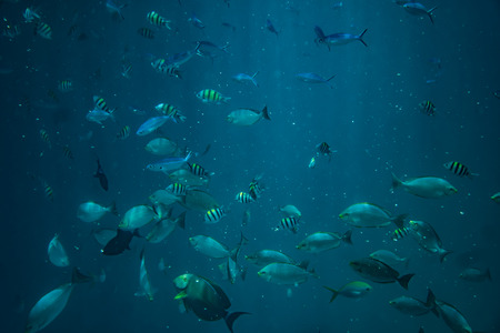 Las Palmas de Gran Canaria, Canary Islands, Spain - July 1st 2018: Visitors enjoy beautiful view of marine life in the biggest tank of new Aquarium Poema del Mar, with the largest curved window of methacrylate for exhibition, which exists in the world.