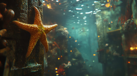A mesmerizing underwater scene featuring a bright starfish surrounded by aquatic life, illustrating the enchanting beauty of marine environments and hidden treasures beneath the waves.