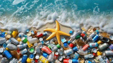 Aerial view of a polluted beach covered in plastic waste. Highlighting the devastating impact of human activities on marine environments and the urgent need for sustainable waste management practices