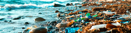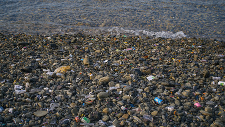 Rocky beach covered with plastic waste, trash, and debris near the shoreline of a calm sea. Highlights environmental pollution and marine conservation issues.