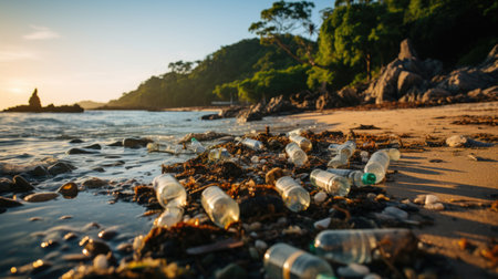 A polluted shoreline at sunset reveals the impact of plastic waste near the water's edge in a serene coastal environment