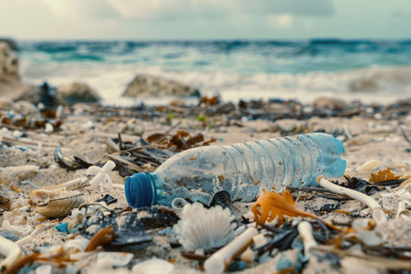 plastic bottle laying on a polluted beach